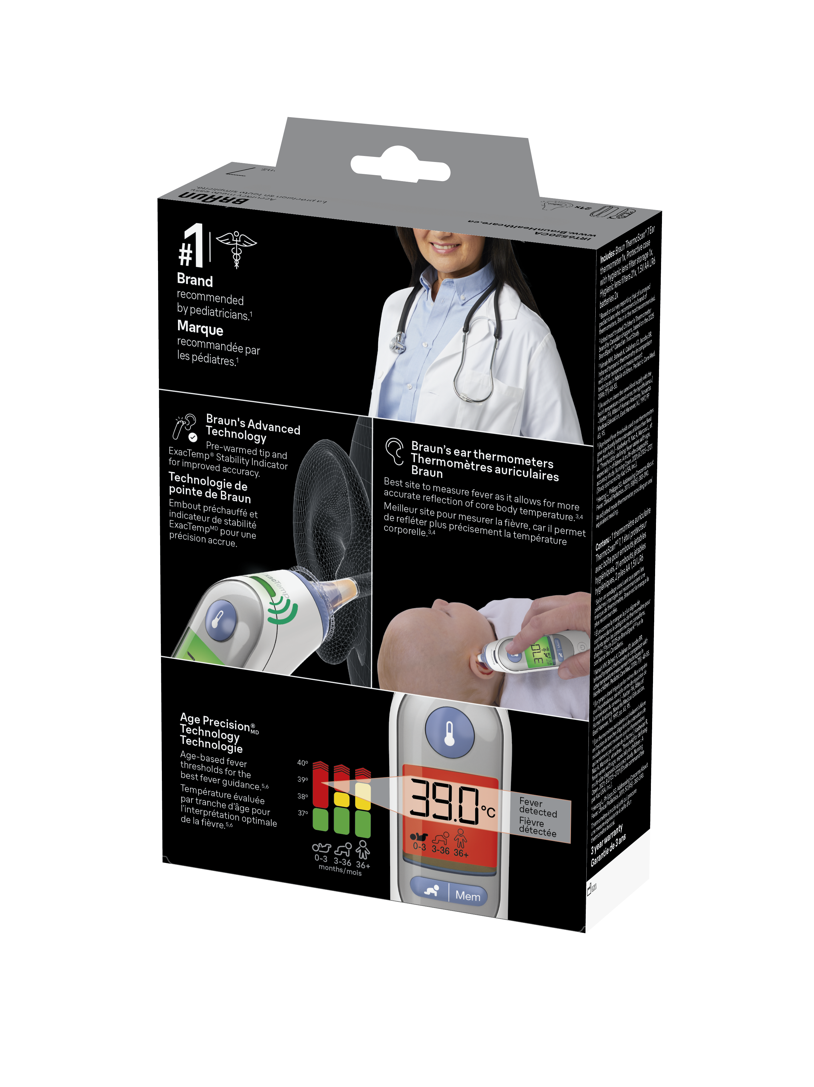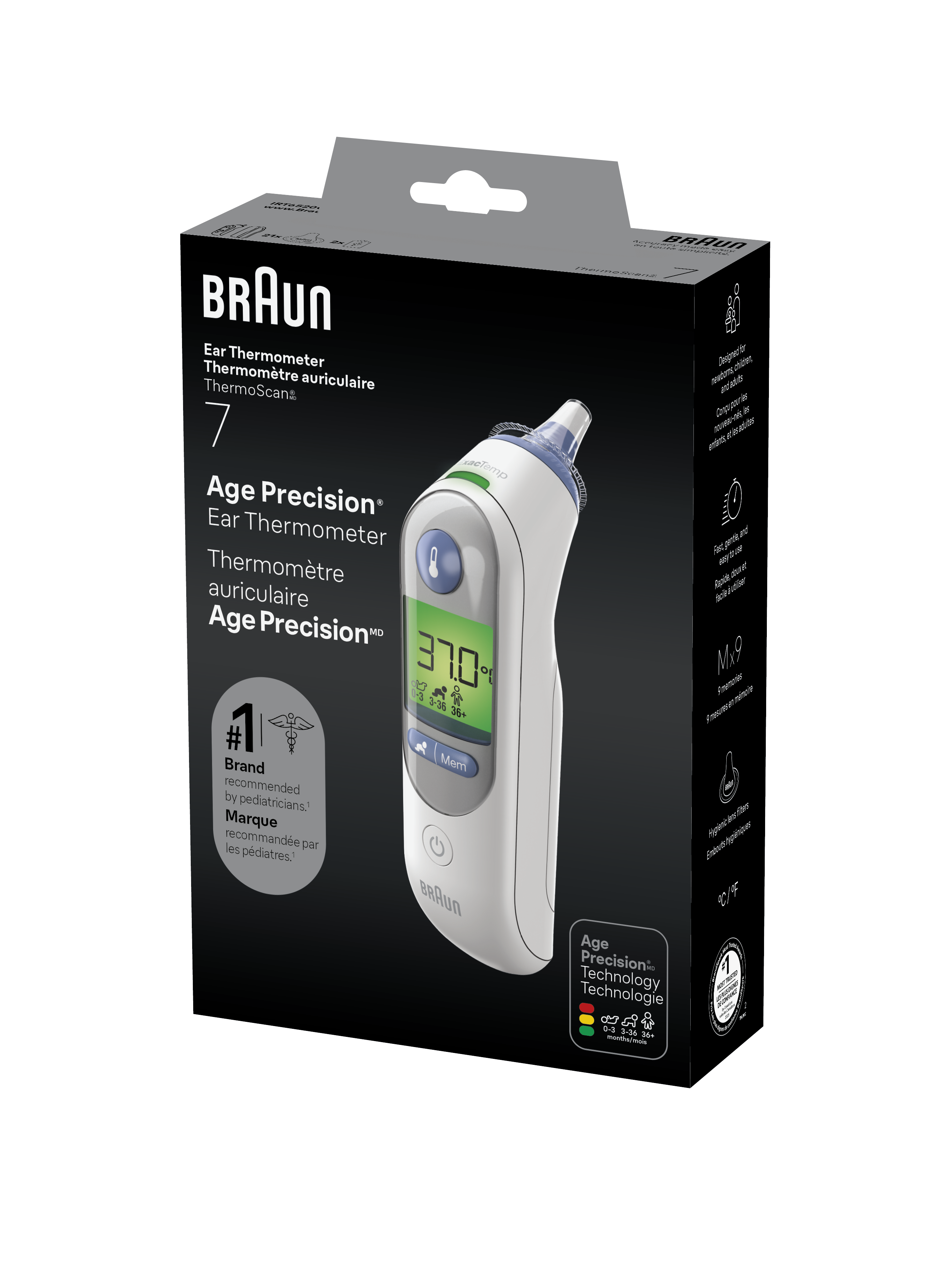 Thanks to its wide-angle probe, The Braun ThermoScan® 7 ear thermometer is designed to give accurate measurements for the whole family, including in the smaller ear canal of a newborn. Take the guesswork out of temperature measurement with Age Precision®